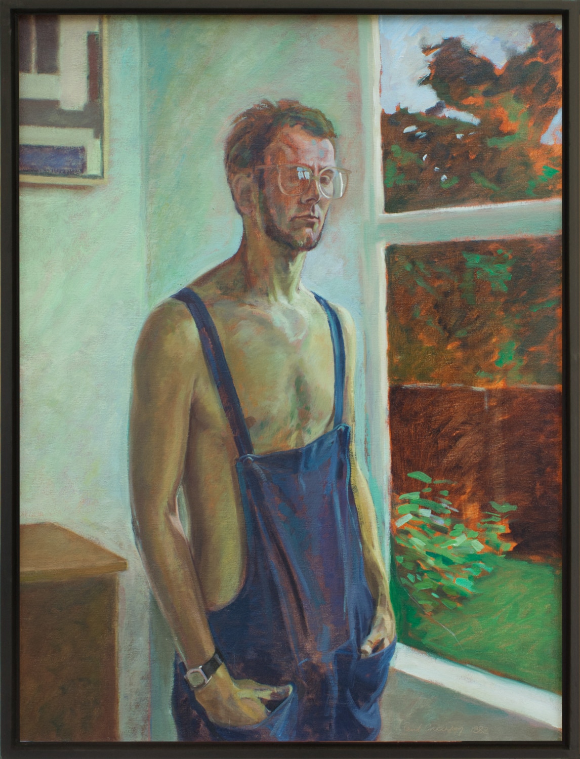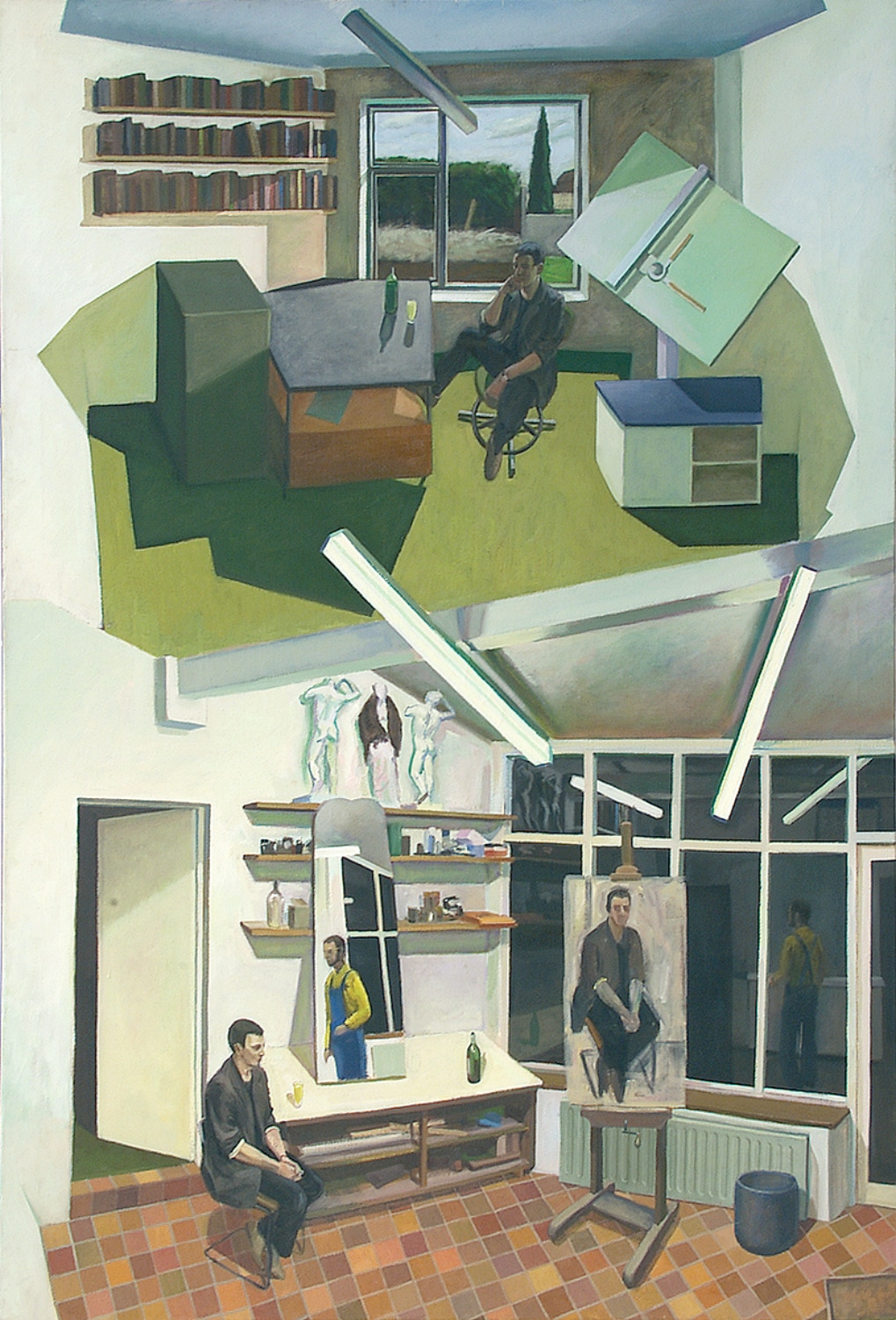 In the painting Day & Night two rooms are shown together, one above the other, linked by the open door and the figure of a man who during the day was in one room and in the evening is in another having his portrait painted.