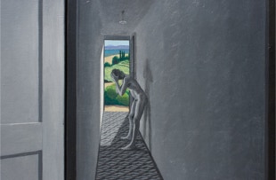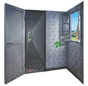 The Time of Remorse is an allegory about change, a change from one situation to another, from good to bad. I used the age-old story of Adam & Eve to try to get closer to that idea of fear; the fear in the imagination, whilst at the same time linking the image to today’s life by making their home as contemporary as ours. Their home has become black, white and lifeless, the Garden of Eden outside is bright and colourful. Eve has been outside to search for fig leaves and, as she reaches inside to give Adam a leaf, her arm loses colour and becomes black and white too. The fig leaf is from the good world and so remains colourful. Adam has his head in his hands in agony of his misdeed of biting into the forbidden fruit and they realize that the whole world around them is changing.